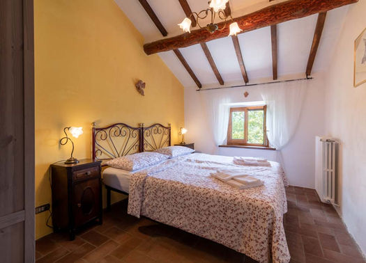 Located on the first floor of the tower, the double room offers a double bed (or 2 single beds), a bathroom (shower, toilet), and a beautiful view of the garden and the Sovara valley.